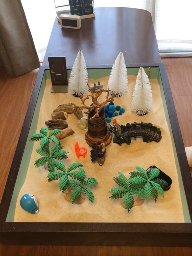 砂とミニチュアを使って、自由に小さな世界をつくる箱庭体験です。