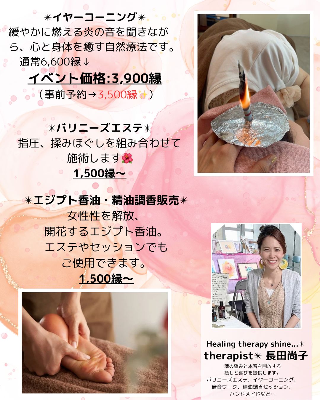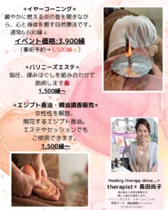 今回は、イヤーコーニングという火のエネルギーを活かして緩やかに燃える炎の音を聞きながら心と身体を癒す自然療法やバリニーズエステの指圧、揉みほぐしを組み合わせて施術します🌺